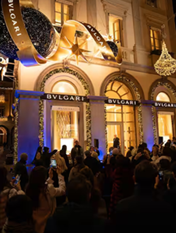 Le maison del lusso guidano questo cambio di passo trasformando le vetrine in narrazioni tridimensionali. A Milano, via Montenapoleone si illumina con architetture luminose che ridisegnano il profilo della strada: archi sospesi, geometrie contemporanee, installazioni che dialogano con le facciate storiche creando un palcoscenico urbano percorribile. Bvlgari impone una grande sfera blu e le icone a stella che creano un cielo in movimento visibile da tutta la via.